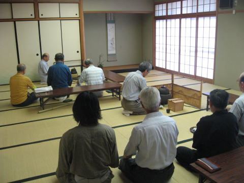 気軽に茶道を楽しめるよう、普段着・作務衣(禅の修行着)で点前稽古をしております 登美ヶ丘南公民館には大きな和室と茶道用水屋があります 茶室としての雰囲気には少し欠けます ←しかし写真のように4.5畳小間設定や8畳広間など自由な設定で茶室を作ることができます ↓講習会時は3室で行い効率UPしました